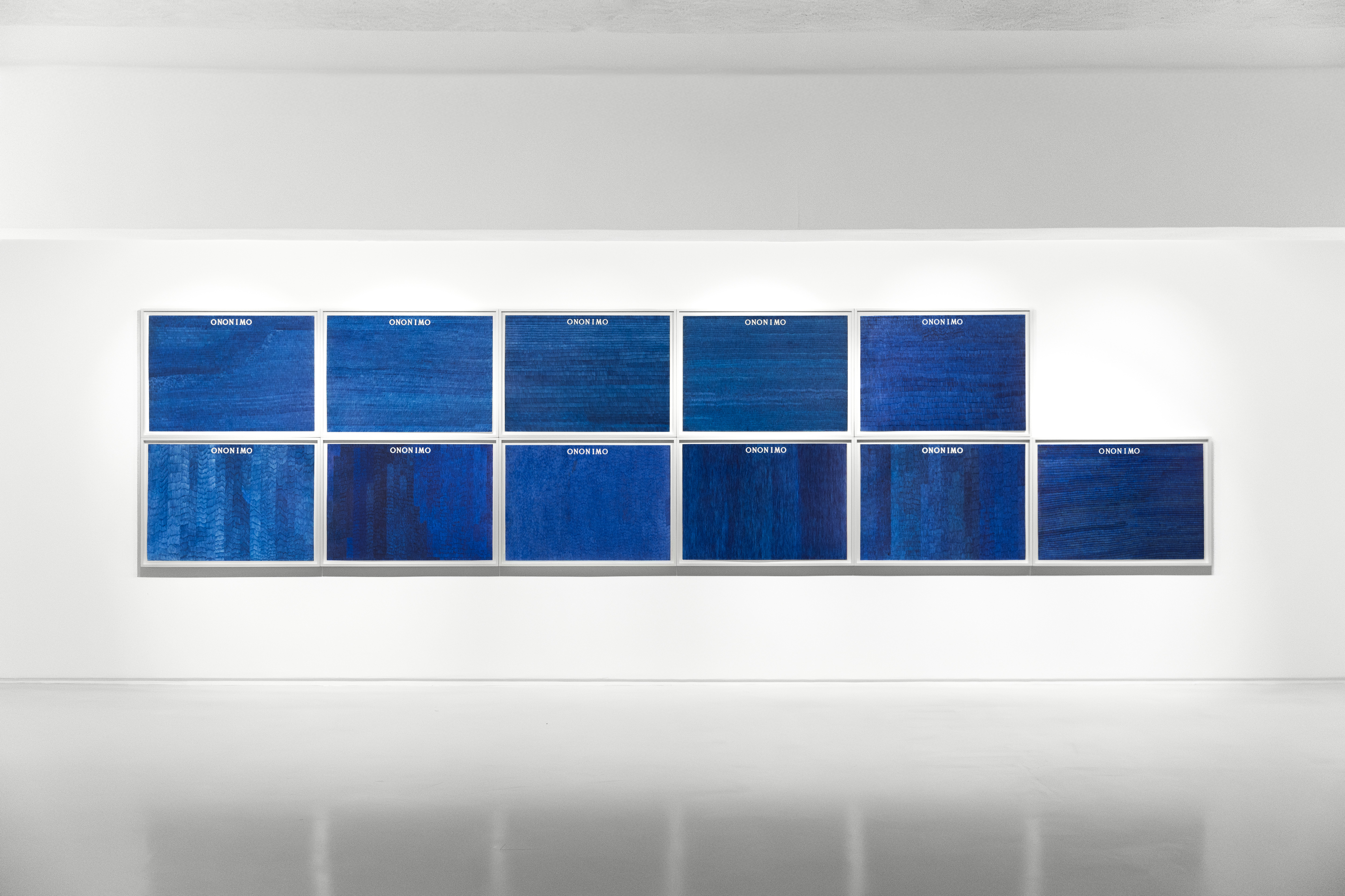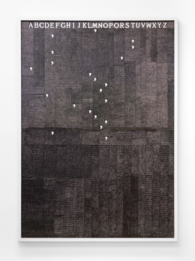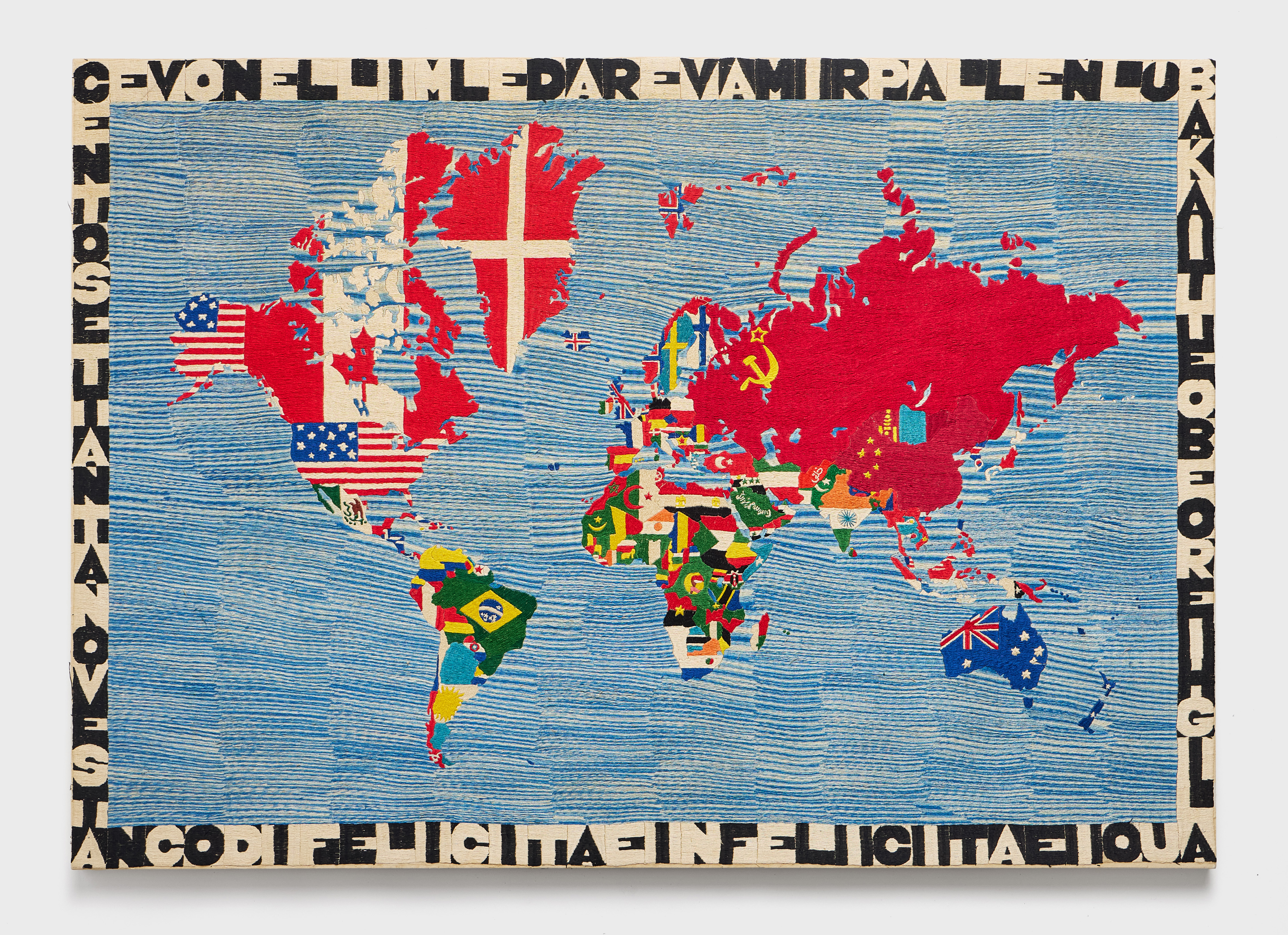 As the exhibition unfolds, this logic of doubling expands into broader systems of language, geography and time. Boetti’s work increasingly turns toward structures that organise vision and knowledge while simultaneously exposing their instability. His sustained engagement with mapping reflects an interest in orientation, distance and the circulation of information, labour and modes of production across cultures. Beginning in the early 1970s, the Biro drawings (1972-), together with the embroidered Ricami (1971-) and Mappe (1971), produced through long-standing collaborations with Afghan artisans, exemplify a deliberate displacement of authorship. Boetti established the conceptual framework and governing parameters of each work, while its execution unfolded through other hands, allowing difference, duration and contingency to become integral to both form and meaning.